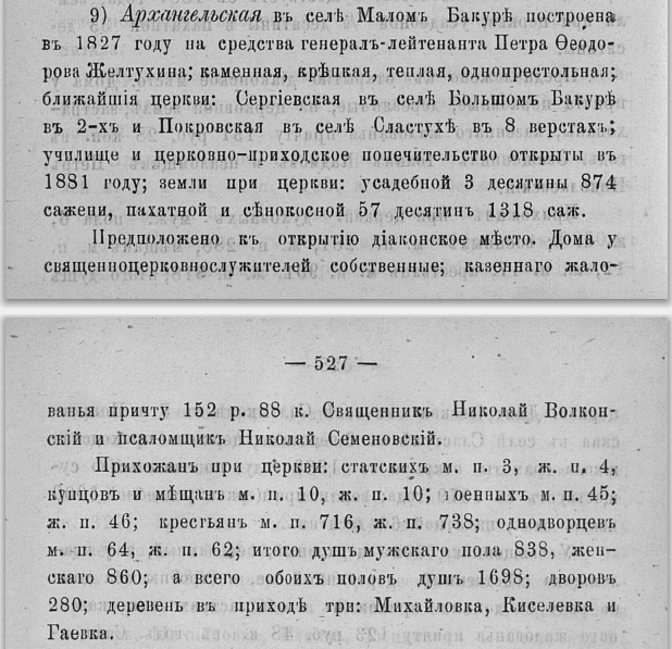 В 1802 - 1808 годах в межевых книгах Сердобского уезда село именовалось Архангельским, Полянщино тож и принадлежало Тайному Советнику Желтухину Ф.Ф., а позже его сыну Петру Фёдоровичу, на средства которого и построена в 1827 году новая церковь, каменная, с такою же колокольнею, тёплая, однопрестольная: во имя Архистратига Михаила (получается, что это третья из известных нам церквей села Малый Бакур).