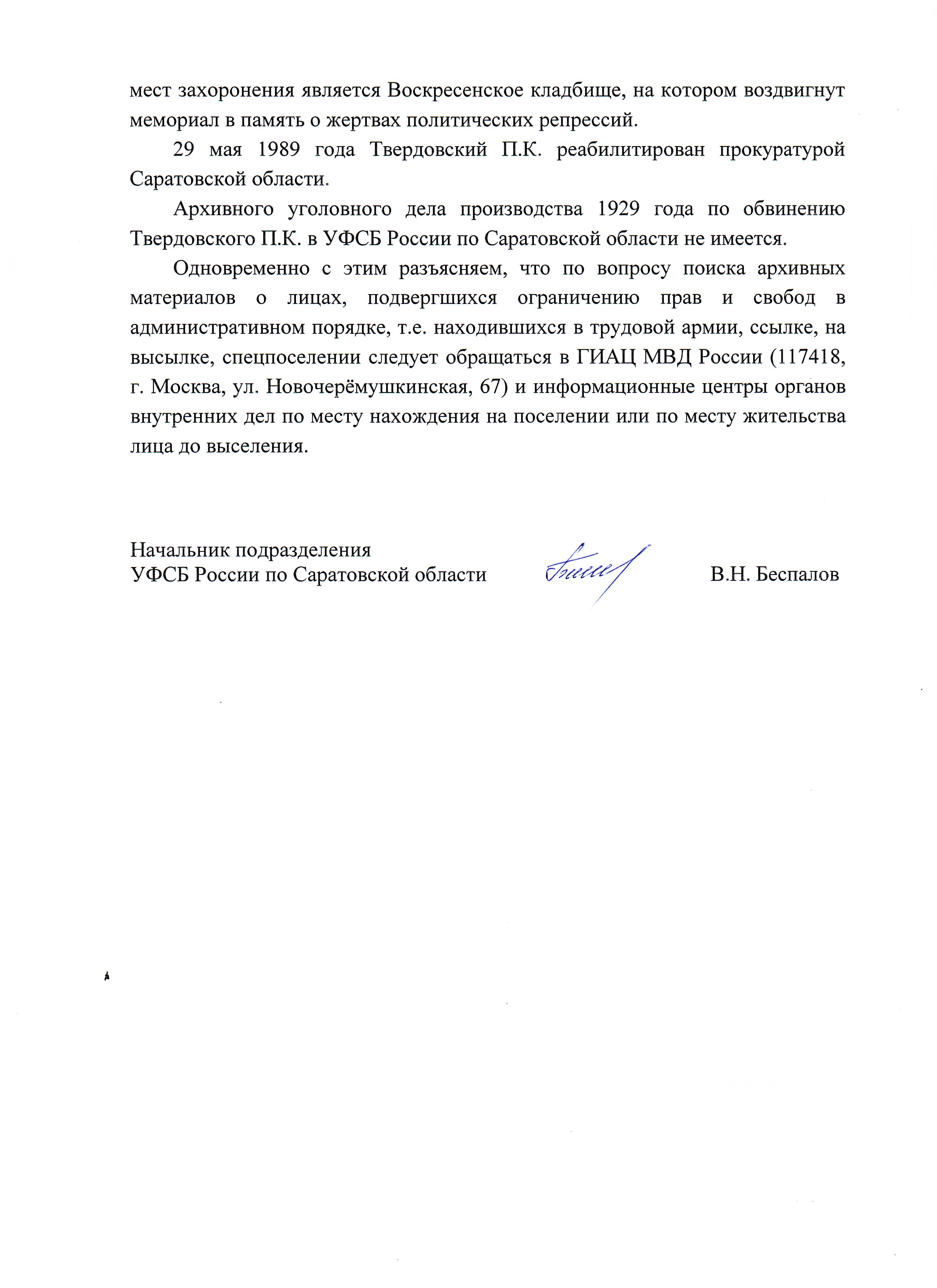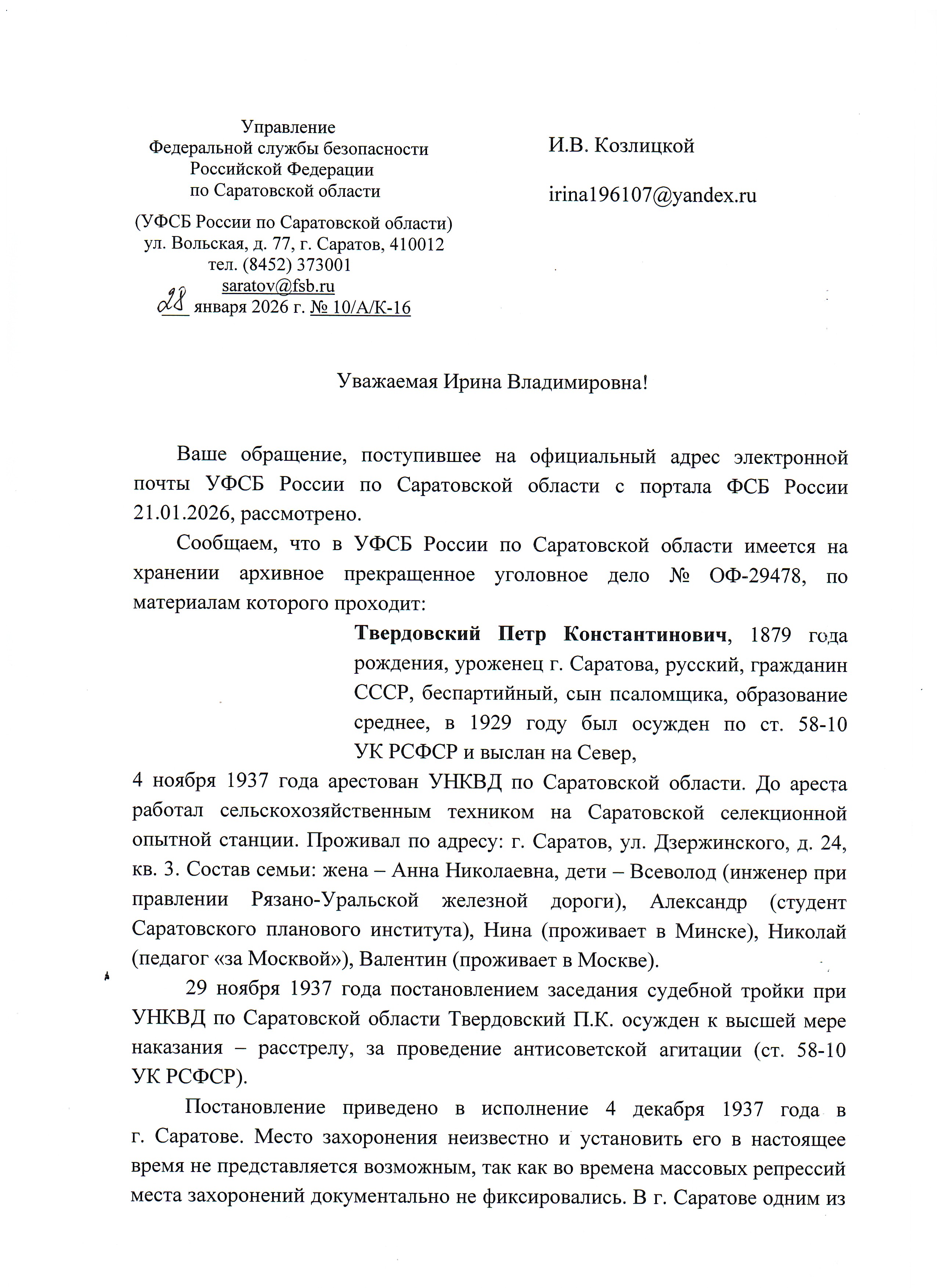 Дело № ОФ-29478 УФСБ по Саратовской области (1937 год). Справка УФСБ РФ по Саратовской области от 28 января 2026 года №10/А/К-16